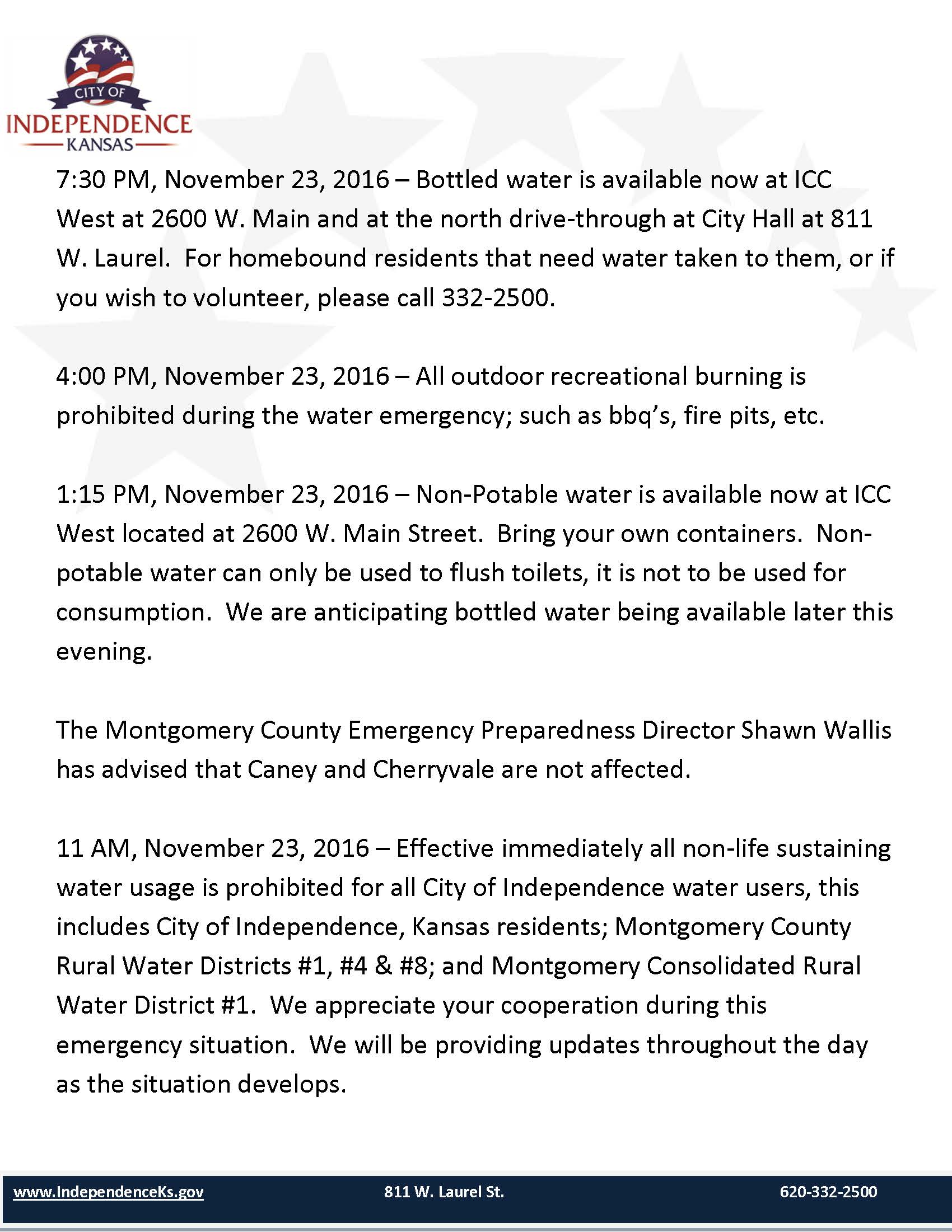 11 AM, November 23, 2016 – Effective immediately all non-life sustaining water usage is prohibited for all City of Independence water users, this includes City of Independence, Kansas residents; Montgomery County Rural Water Districts #1, #4 & #8; and Montgomery Consolidated Rural Water District #1. We appreciate your cooperation during this emergency situation. We will be providing updates throughout the day as the situation develops.